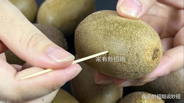 三:牙簽法。 我們先用牙簽在獼猴桃的表面戳上一些小洞,戳這些小洞的目的就是為了加速獼猴桃本身乙烯氣體的釋放,這樣就能加速獼猴桃的催熟了。