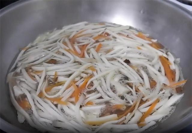 4.起鍋燒水,把杏鮑菇和胡蘿卜一起下鍋焯水,煮個兩分鐘,把杏鮑菇煮軟了就可以撈出了。