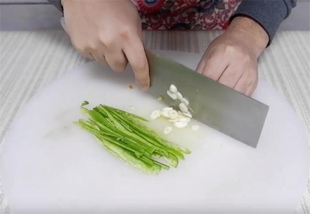 2.再把半根胡蘿卜切絲,少量的青椒切絲,再切少量的蒜末。