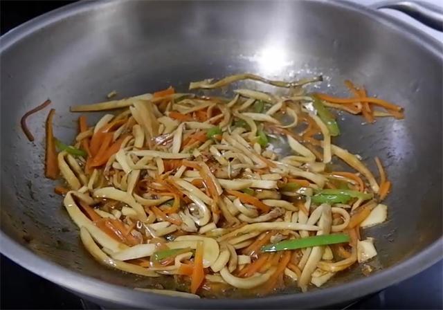 5.再另起鍋,加少量的油,加入蒜末炒香,加入青椒絲,把青椒絲炒出辣味,接著下入杏鮑菇和胡蘿卜翻炒均勻,然后倒入料汁,大火炒勻就可以出鍋了。
