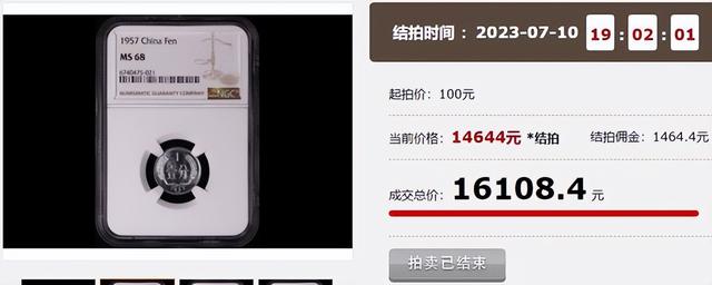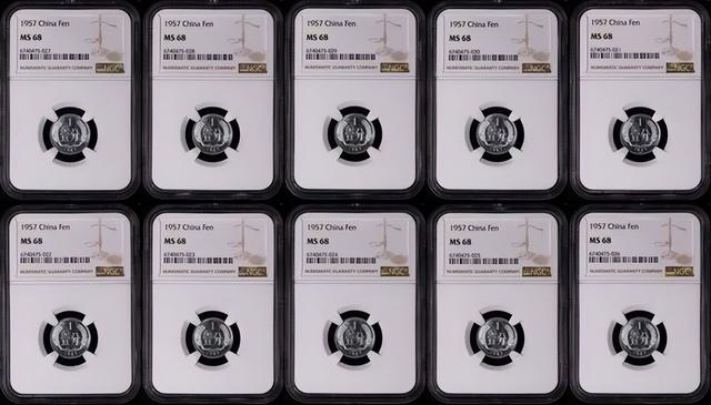 在7月的一場網拍中就出現了數十枚全新的57年的1分,其中圖片中這10枚NGC68分的拍出了16000多,單枚也要1600多,值得提的是,它們是10枚才上萬的,實際上在今年4月的拍賣會中,就有一枚品相更好的NGC69分的57年的一分硬幣。