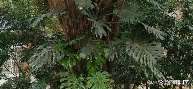 路邊生長的龜背竹就已經是非常大了,如果是去當地的公園,公園里附著樹干生長的野生龜背竹,整體的生長狀態更能讓人吃驚,一整棵大樹上都爬滿了龜背竹,野生的龜背竹葉片的顏色是深綠色的,經過了多年的生長根系,根系已經牢牢的扎根到了土里,枝干上的根系已經牢牢地附著在了樹干上。(www.ws46.cOm)