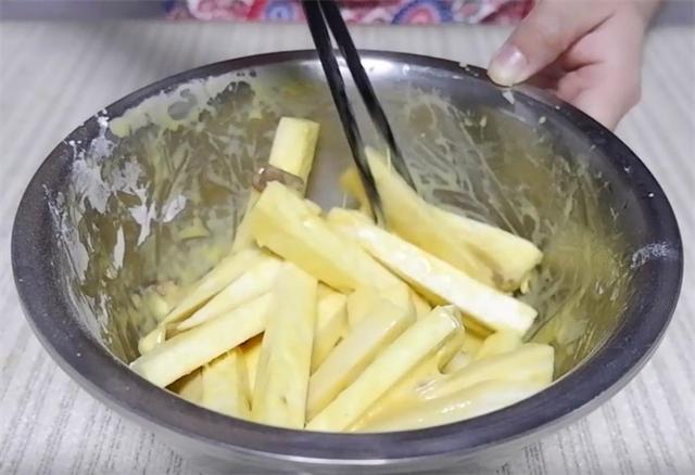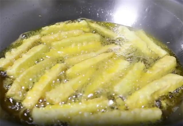 3.起鍋燒油開炸,六成油溫把杏鮑菇下鍋,中火炸定型,稍稍變色就可以撈出了。