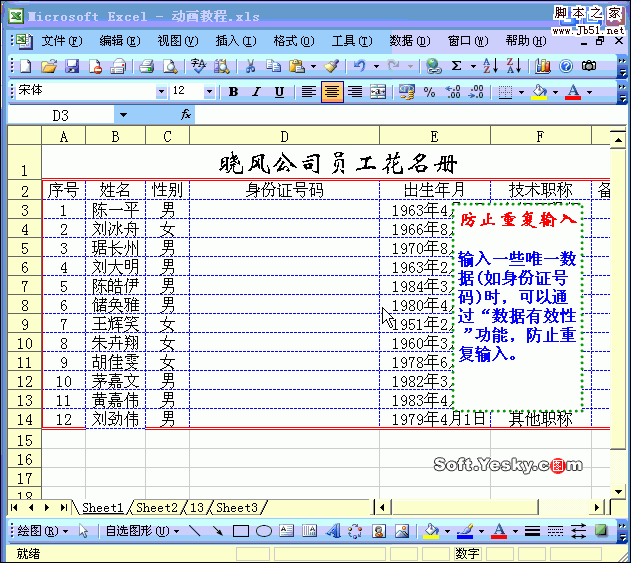 員工的身份證號碼應該是唯一的,為了在Excel中防止重復輸入,我們用“數據有效性”來提示大家。www.ws46.com 選中需要建立輸入身份證號碼的單元格區域(如D3至D14列),執行“數據→有效性”命令,打開“數據有效性”對話框,在“設置”標簽下,按“允許”右側的下拉按鈕,在隨后彈出的快捷菜單中,選擇“自定義”選項,然后在下面“公式”方框中輸入公式:=COUNTIF(D:D,D3)=1,確定返回。以后在上述單元格中輸入了重復的身份證號碼時,系統會彈出提示對話框,并拒絕接受輸入的號碼。 |