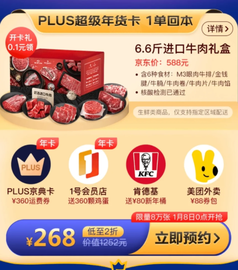 2022年京東plus超級聯(lián)名卡權(quán)益:268元包含6.6斤進口牛肉禮盒 京東plus 1號會員店 肯德基 美團外賣 可以說很沒有誠意,根本就沒啥人購買~