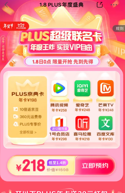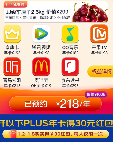 1月8日零點開始,有京東,騰訊,愛奇藝,芒果,百度文庫,喜馬拉雅,1號會員店都是年卡。 |