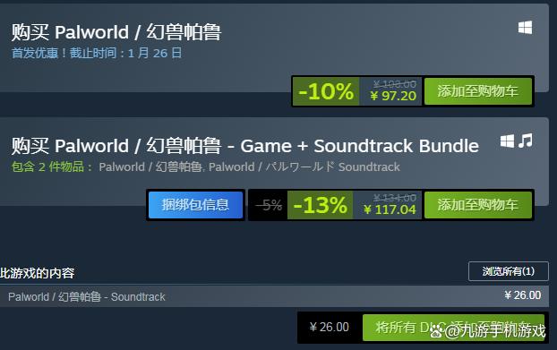 由于游戲是以搶先體驗版的形式上線的,所提首發平臺只有steam和xbox,而steam上總共分為了三個版本。標準版現在有9折的優惠,售價為97.2元,而豪華版僅僅多出了一個音樂包,游戲加上這個捆綁包的折扣為87折,售價是117.04元,不過還有一個額外的DLC擴展售價為26元,目前首發優惠截止日期到1月26日。