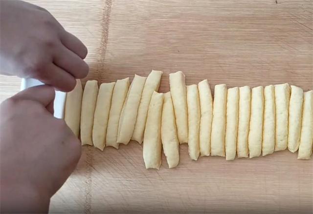 2.由于這個季節溫度比較高,面團大約25分鐘就發酵到原來的1.5倍大,然后我們把它揉搓排氣,直接搓成長條狀按扁,大約下30個面劑左右,不要下的太大,如果太大的話,炸制的時候內部不容易炸的酥脆。