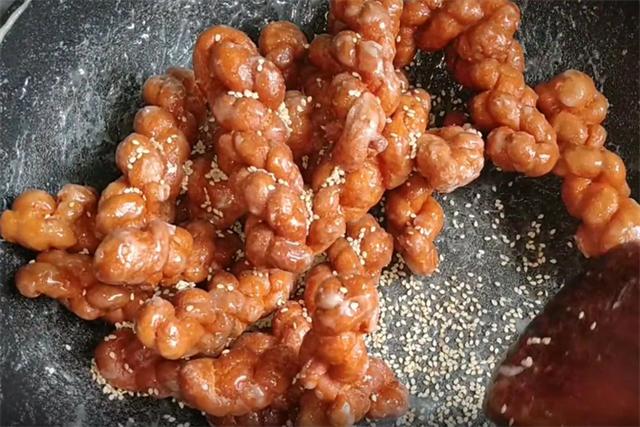 8.然后糖液粘稠,倒入麻花快速翻炒,使糖漿均勻地裹住麻花,趁熱撒上芝麻。