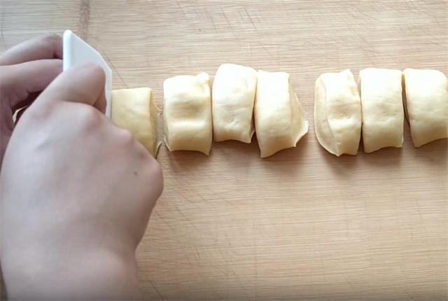 3.接下來把發好的面放在案板上揉搓排氣,一定要多揉一會兒,把里面的氣體排干凈,這樣我們二次醒發的時候,他的氣泡才會均勻,口感才會更細膩,把揉好的面搓成長條,下10到12個面劑即可。