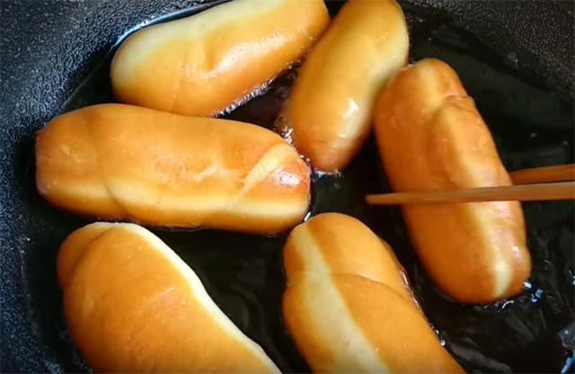 6.起鍋開小火,油溫四成熱下入生坯,低油溫下鍋能夠防止面包的表面焦糊,而內部卻不熟的現象,炸至底面金黃,我們翻面,炸至兩面都成金黃色即可出鍋,全程約炸制4到5分鐘。