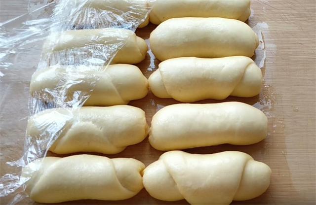 5.所有生坯做好之后,我們在案板上和生坯上抹上一層油,防止醒發的時候粘連,蓋上保鮮膜密封醒發至兩倍大,這個時間約30分鐘到40分鐘,醒發至體積明顯變大,拿起來輕飄飄的即可,只有醒發到這種程度,我們做出的面包才會特別的松軟,而且炸制的時候它是漂浮在油上面的。