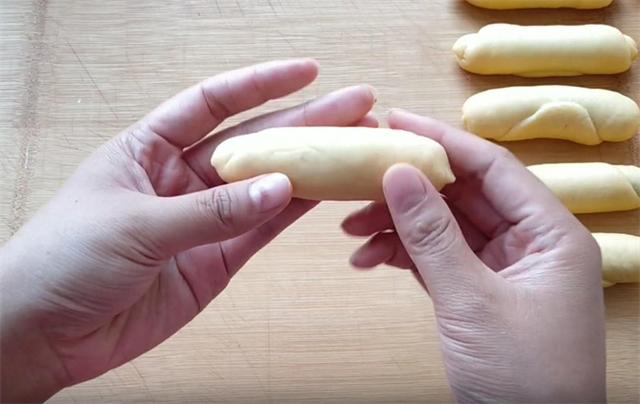 4.然后我們把面劑用手按扁,用搟面杖從中間向兩端把面皮搟薄,包入豆沙餡卷起,捏合兩端,防止豆沙餡露出,然后放在案板上把它搓均勻搓細,這樣的做法能夠使面包層次豐富,口感更加的柔軟。