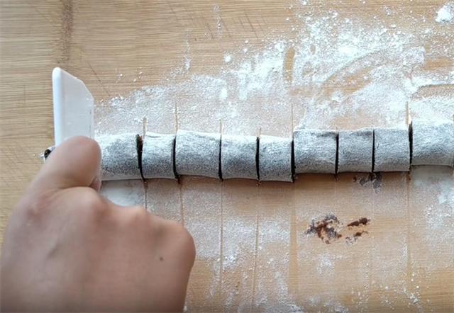 2.我們準備一些豆沙餡,沾上干面粉,把它搓成長條,下10到12個劑子,然后把劑子搓圓備用。