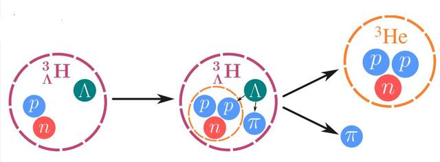 為了發現這些超核,物理學家使用了一種新的技術來分析大型強子對撞機收集到的數據。他們并沒有直接探測到超氚或反超氚,而是探測到了它們衰變后產生的粒子。當不穩定的粒子衰變時,它們會轉變成一系列更低質量的粒子。 質子在大型強子對撞機中相互碰撞,釋放出一定的能量,有一定的幾率產生一些粒子的混合物。在這種罕見的情況下,一個超氚會出現,它會飛行大約40厘米,然后在大約240皮秒內衰變成一個反質子和一個π 介子。π 介子會從核中飛出,但反質子會留在核內,使超氚轉變成反氦。