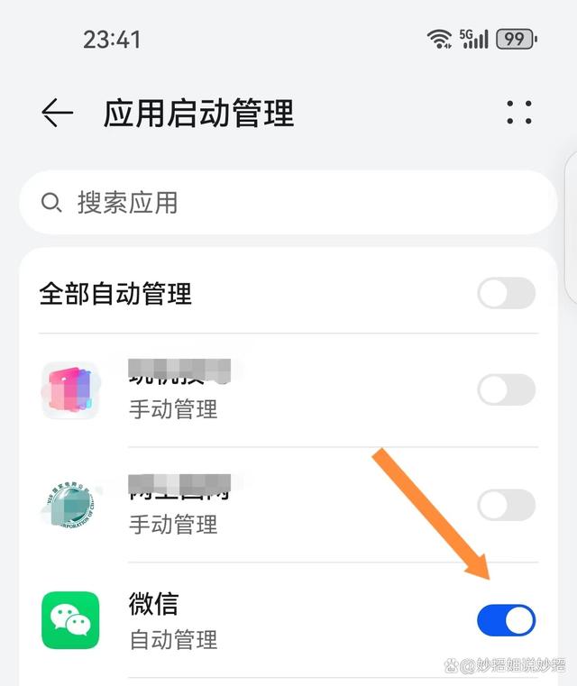 三:開啟應用后臺刷新功能。 很多小伙伴為了節省電量,就關閉了手機上大部分應用程序的后臺刷新功能。然而,如果禁止微信在后臺運行,微信就無法及時收到好友消息。那么這個時候,我們就需要將應用后臺刷新功能給開啟了。 方法很簡單,先打開手機的設置,在設置頁面中找到應用與服務,接著點擊應用啟動管理。在這個頁面中就顯示著手機的各個應用,我們再找到微信。如果微信后面的開關是關閉的,那么微信就不能自啟動,也不能關聯啟動,而且也不會在后臺活動,這樣我們就會無法及時接收到信息了。這個時候,我們只需要將后面的開關打開,它就可以避免我們錯過消息了。