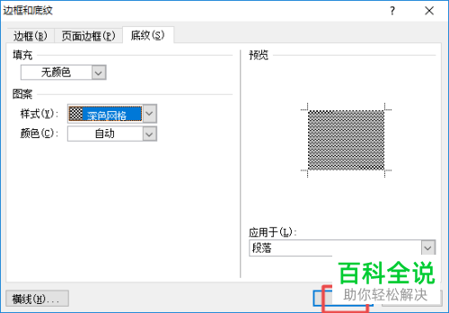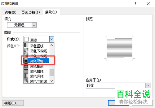 4. 打開邊框和底紋窗口后,點擊上端的“底紋”,點擊“樣式”旁的下拉箭頭,將其設置為“深色網格”。設置完后,點擊“確定”。