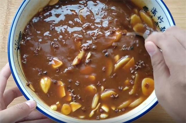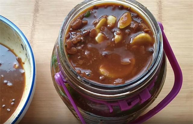 6.接下來我們來準備醬料,海天黃豆醬800克,這個醬料可以選擇自己喜歡的口味,再準備約450毫升的涼白開,加入涼白開能夠防止腌制的時候細菌滋生,倒入醬料中,把事先準備好的80克姜,50克蒜片倒入,加入40克鹽,30克的味精,然后再加入3到5克的花椒,能夠起到殺菌增香的作用,攪拌均勻備用。