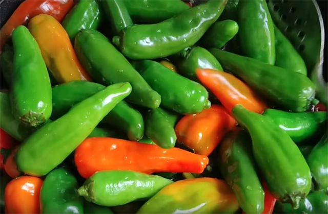 4.鍋中水燒開,倒入辣椒焯水兩分鐘,顏色翠綠撈出晾涼,一定不要焯時間久了,這樣口感就不脆爽了。