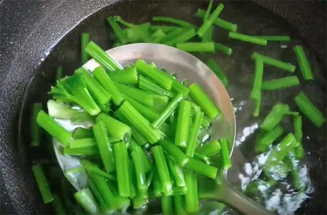5.利用熱水把芹菜焯30秒鐘出鍋,焯水一是能夠起到殺菌的作用,二是能夠使辣椒稍微軟化,更容易腌制入味,再把辣椒平鋪晾干水分。
