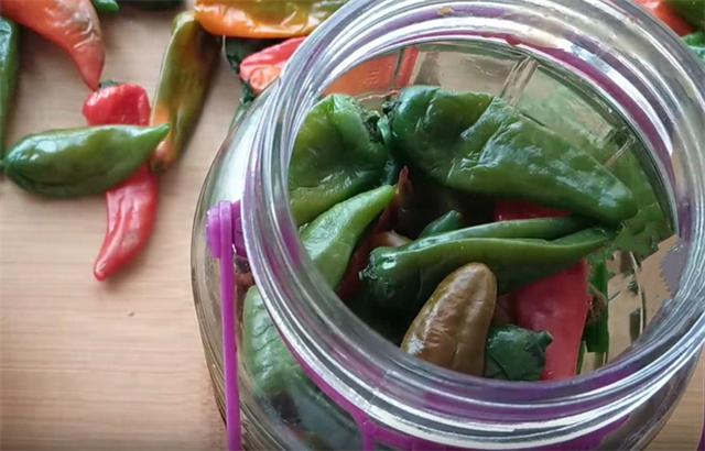 7.然后我們準備一個無水無油的罐子,把晾涼的辣椒放入,罐子中放一層辣椒,放一層芹菜,然后再加入適量的醬汁,這樣能夠使味道腌的更均勻,放入辣椒的時候,用手用力按壓一下,使其更加緊實,這樣能夠放入更多的辣椒。