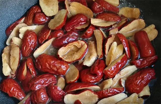 2.接下來我們準備大棗300克,挑選個頭飽滿一些的,洗凈去核,當然也可以加入一些蜜棗,把切好的大棗倒入鍋內,加入500毫升清水,蓋上蓋子中火煮五分鐘。