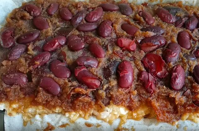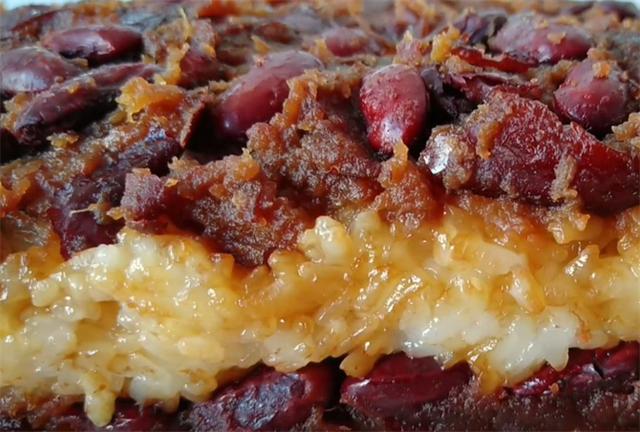 7.然后鋪上一層米飯,按壓平整,在糯米的上層再均勻的鋪上一層棗泥,鋪的均勻一些,然后再撒上一些豆子,上面再覆蓋上一層糯米飯,并輕輕壓實,按壓平整,最后上面用棗泥和豆子封頂,放入蒸鍋中大火燒開轉中火蒸30分鐘,蒸的時間越長口感越好,關火燜20分鐘。
