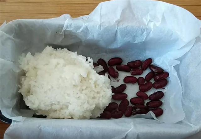 6.接下來我們選取一個模具,底部鋪上油紙,便于后續脫模,當然如果沒有的話,也可以不放這個模具,就是我們平時做飯的盆也是可以的,上面先鋪一層紅蕓豆。