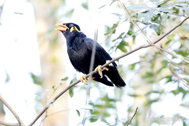 畫眉是中國特產鳥類,為廣州市市鳥。畫眉具有明顯的性別二態性,雄鳥和雌鳥的羽色明顯不同。雄鳥頭上、背部和尾部為灰褐色,腰部及兩側為黃色,喉部和胸部為白色,眼睛周圍為黑色。雌鳥則整體呈現灰褐色,腰部和兩側也有些微的黃色斑點。畫眉主要分布于中國,它不僅是重要的農林益鳥,而且鳴聲悠揚婉轉,悅耳動聽,又能仿效其他鳥類鳴叫,被譽為’鹛類之王’馳名中外。它們善于模仿人類的聲音,尤其是雄鳥,會發出悅耳動聽的歌唱聲以吸引雌鳥。畫眉是非常活潑好動的鳥類,也是很受人喜愛的寵物之一。 4、鷯哥(Gracula religiosa)