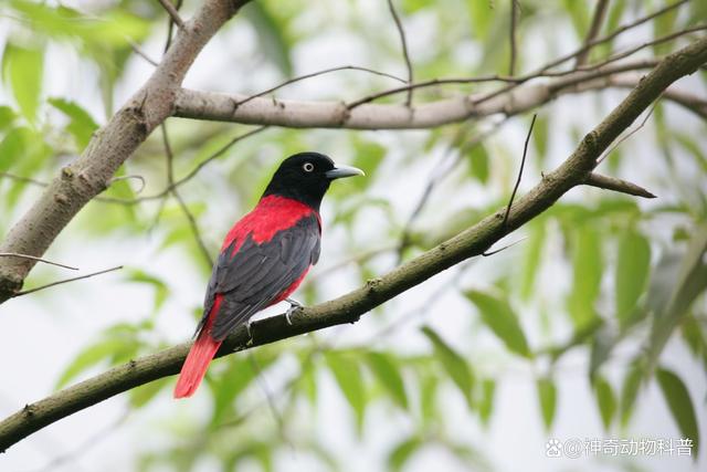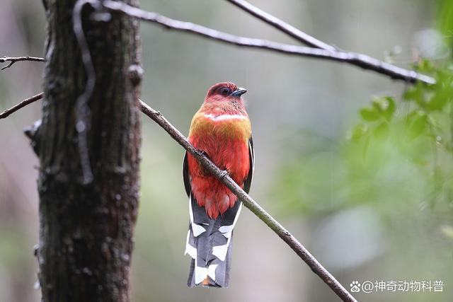 紅頭咬鵑體長31-35厘米。身體多紅色,體大,頭圓而尾長。雄鳥頭紅色,紅色的胸部具狹窄的半月形白環(huán),背部頸圈缺失;雌鳥頭黃褐色,區(qū)別于其他所有咬鵑,胸腹部紅色不如雄鳥鮮艷,下胸處具半月形白環(huán)。虹膜褐色,眼周裸皮藍色,喙近藍色,腳偏粉色。國內(nèi)見于西南、華中、華南等地區(qū)。喜單個或成對靜立于密林的低樹枝上,從棲處飛起獵取食物,見于熱帶及亞熱帶森林地帶,高可至海拔2400米。 3、赤紅山椒鳥