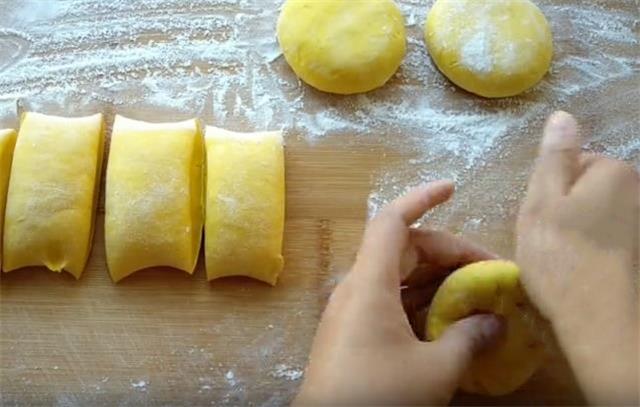 4.接下來我們把面劑像這樣翻轉按壓,這樣做出來的餅口感更加筋道,把它搓成圓形的餅坯。