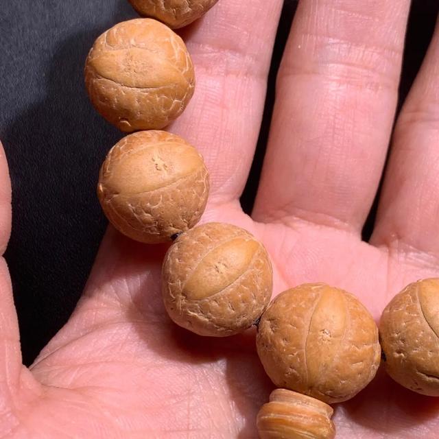 第三方面就是挑選鳳眼菩提的形狀,現在市場我們能看到最多的是圓珠的,和藏式的為主,之前還有切片的,就是把兩頭都給切掉直留中間眼睛的部分,還有扇面的,就是把每顆籽切成一個倒三角的形狀,然后拼成一個單圈的手串,但是現在隨著鳳眼菩提價格的回落,后兩種費工又費時又不討好,市場又不認可,這種形狀現在已經很少見了,倒是有幾家工作室現在不在形狀上動心思,在鳳眼菩提的眼睛上動心思,比如在眼睛上鑲寶石或者鑲黃金,市價自然是不菲的,就這種對產品開發的工匠精神,和對文玩行業的執著就該給他們點一個贊,所以在挑選鳳眼菩提形狀的時候首選圓珠。