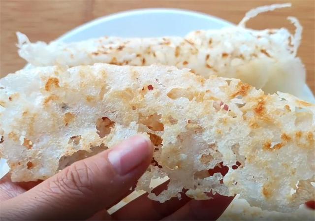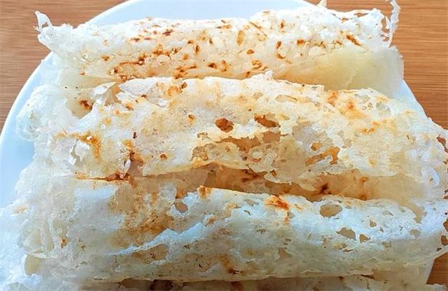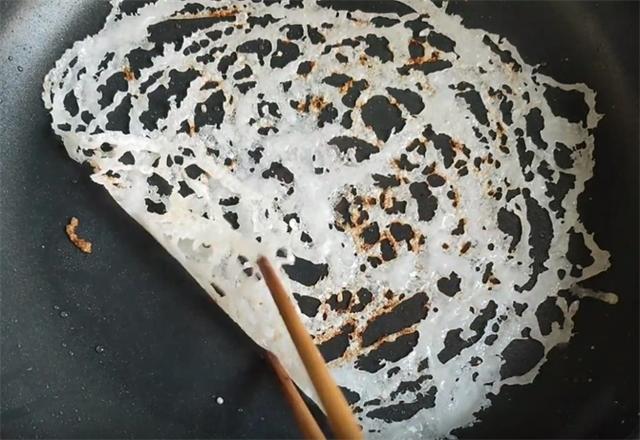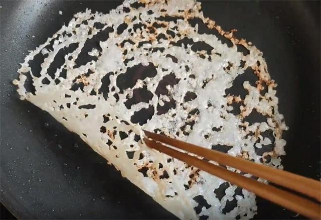 4.烙至米漿邊緣金黃,然后把它卷起。