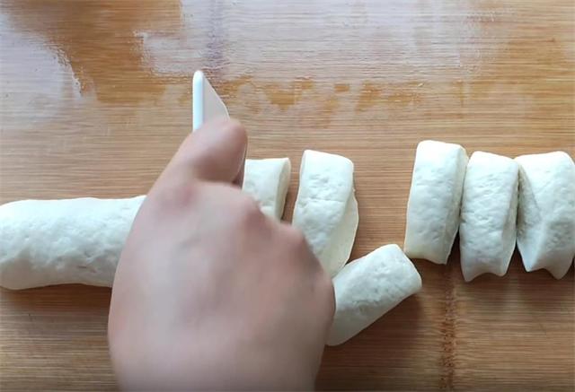2.然后在案板上抹一些油,直接把面團搓成長條,下12個面劑。
