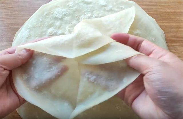 5.我們把面劑先用手按薄,涂抹上一層油,再撒上一些干面粉增加摩擦,把2到3個面皮摞在一起,先用手按薄,再用搟面杖盡量把它搟薄。