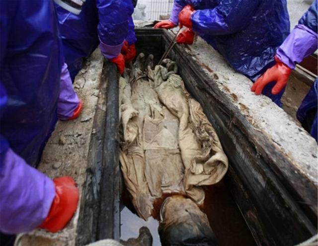 在2011年的時(shí)候,江蘇泰州又發(fā)現(xiàn)了一具來自于明代的不腐的尸體。2011年2月,一組施工團(tuán)隊(duì)正在江蘇泰州附近施工,可挖掘機(jī)工作了一會(huì)兒之后竟然被一個(gè)硬物卡住了,于是司機(jī)下地查看,發(fā)現(xiàn)地下埋著的是一個(gè)巨大的棺材,這位司機(jī)覺得自己可能挖到了地下的古墓,于是趕緊上報(bào)。 經(jīng)過層層審批之后,專業(yè)的考古學(xué)家來到了江蘇泰州附近,而且在考古學(xué)家的認(rèn)證之后,確定這一座古墓就是來自于六百多年前的明代古墓。考古專家發(fā)現(xiàn)古墓之后,立刻進(jìn)行保護(hù)性的挖掘,最一開始在古墓內(nèi)并沒有什么實(shí)質(zhì)性的文物出土,直到第三具棺槨被打開之后,考古學(xué)家被眼前的景象震驚到了。