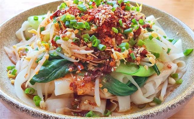 準備食材: 普通面粉、土豆淀粉、鹽、涼水、青菜、豆芽、蒜末、蔥末、生抽、陳醋、香油、白糖、辣椒粉、白芝麻、食用油 具體做法: