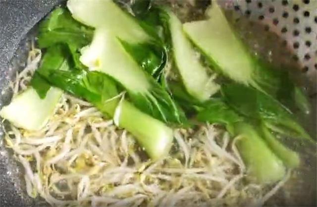 2.把青菜和豆芽洗凈,水開加鹽,下入青菜豆芽焯水,撈出沖涼控干備用。