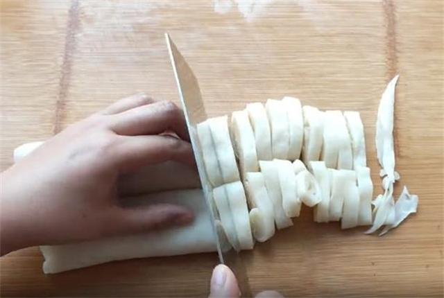 5.接下來我們把2到3張面皮重疊在一起,從上下向中間卷起,然后倒扣,最后我們用刀把它切成合適的寬條,切好以后,我們把它抖散抖開,這樣面條就做好,這個面條特別適合涼拌,各種口味的都可以。