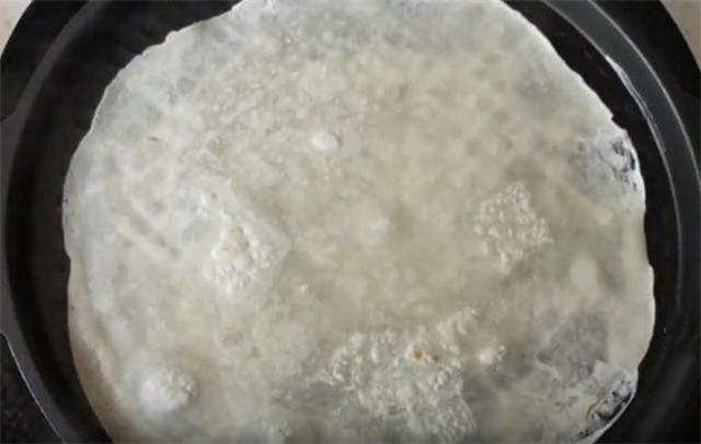 3.電餅鐺開小火,不需要放油,倒入面糊,用刮板快速的刮開刮均勻,這個面糊要比平時的煎餅稍微厚一些,蓋上蓋子燜15到20秒,兩面微微變白即可出鍋。