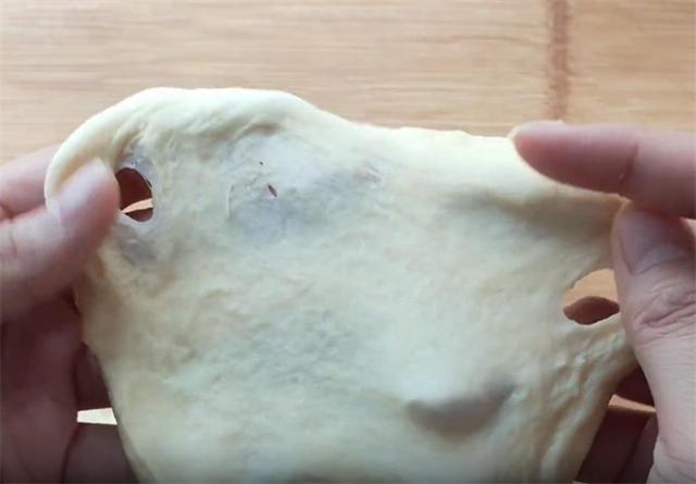 4.只有揉出這種薄而透明的膜,這樣做出的面包才會松軟細膩,用這種搓洗式的方法揉,大約揉10到15分鐘即可出膜。
