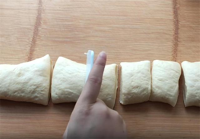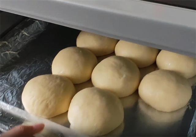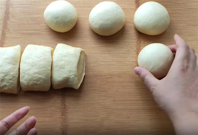 5.然后把面團醒發至兩倍大,把發好的面團再次揉搓排凈里面的氣體,這樣做出的面包才會口感細膩,然后下8到10個面劑。