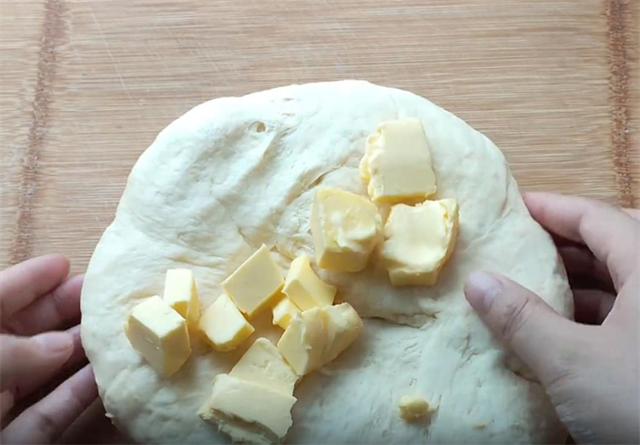 2.醒好的面,我們加入30克黃油,把黃油完全融進面團,剛開始加黃油的時候,這個面團會有一些粘手,大家不要放棄,一定繼續揉,揉到最后一定是特別光滑的。