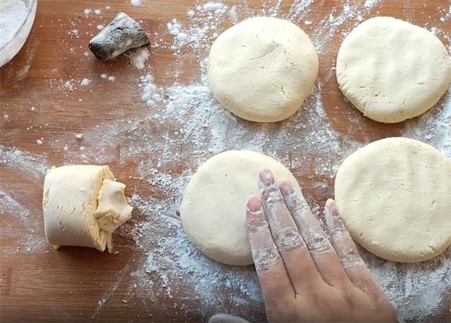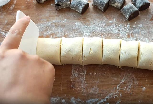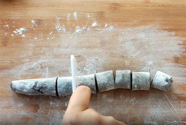 3.第二天一早我們把買的現成的豆沙餡,利用干面粉搓成長條,下八個面劑。