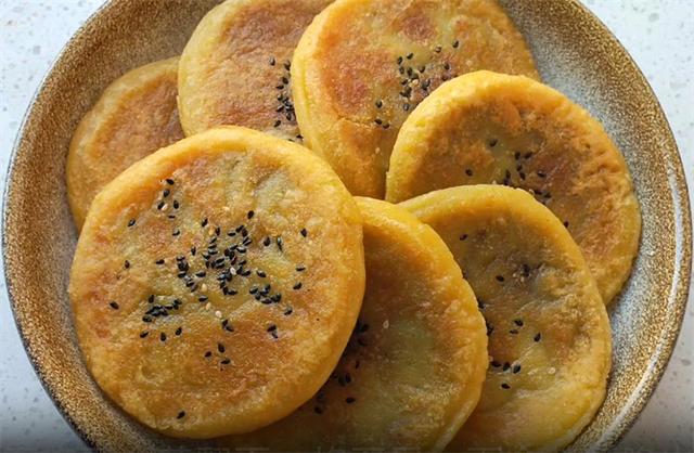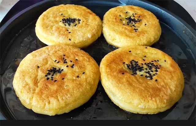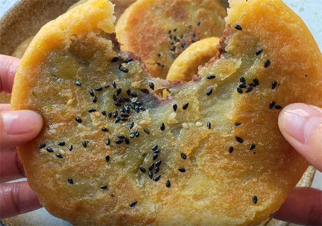 7.電餅鐺開小火,油溫五成熱,正面朝下下入餅坯,然后我們在底層再撒上一些黑芝麻,當然也可以不放,按壓緊實,烙至底面金黃,我們翻面大約需要烙一分半到兩分鐘,翻過來之后再烙一分半到兩分鐘,兩面金黃酥脆即可出鍋。