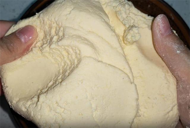 2.然后加入十克白糖,再加入三克酵母,溫水130毫升,把酵母化開,邊倒邊攪拌,攪成面絮狀之后,我們開始下手揉,最后把它揉成中等軟硬的面團,玉米面燙過之后,一是口感更細膩,二是有一定的粘性,這樣面團更容易操作,因為這兩種面粉都不含有面筋,然后我們蓋上保鮮膜密封冷藏一夜。