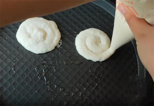5.電餅鐺開小火刷少許的油,像這樣由內(nèi)向外轉(zhuǎn)圈擠出面糊,這樣做出的餅會(huì)比較圓。
