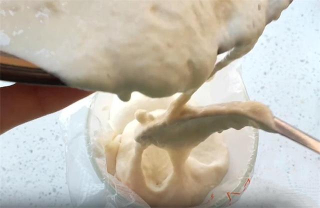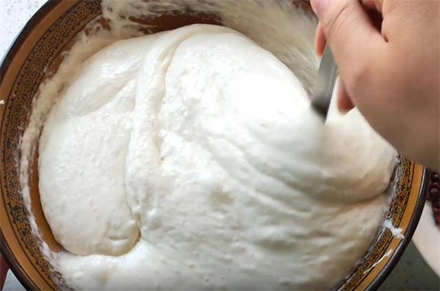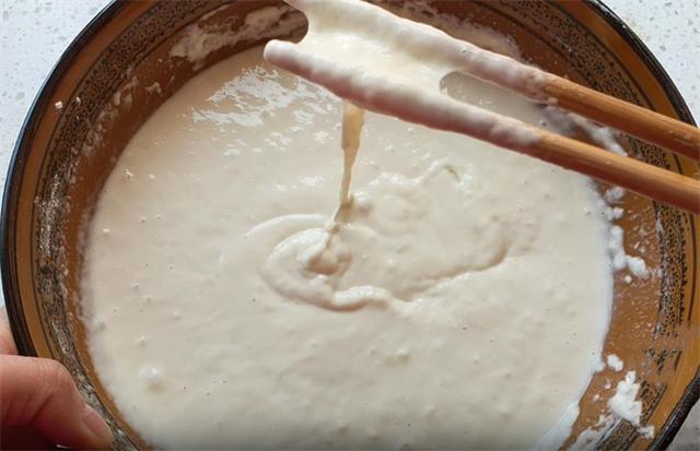 3.早起以后,先把發(fā)好的面用勺子攪動(dòng)一下,排出大的氣泡,這樣防止烙制的時(shí)候塌陷。