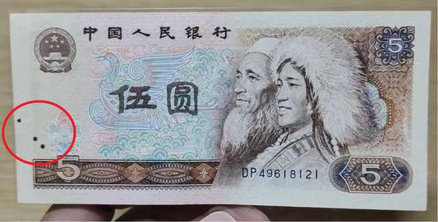第四套人民每一張錢幣都會有盲文的黑點,大家也可以看一下其它的面值,正常的5元只有2個盲文點,但是圖片中這張多了一個點,水印就把它稱之為盲文多點,像這種情況是屬于錯版的范圍。