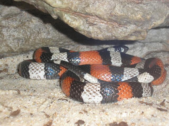 2、帕布拉奶蛇 帕布拉奶蛇是一種分布于中美洲,主要生活在墨西哥的柏布拉、莫雷羅斯、瓦哈卡等地區的蛇類。它們主要棲息在干燥的草原、樹林、農耕地和荒野中。這種蛇不具有毒性,體長在70~90厘米之間,身體細長,頭部呈橢圓形,頸部不明顯,很難與頭部區分開來。全身鱗片平滑有光澤,尾巴末端非常尖細。帕布拉奶蛇頭部前半部分通常為黑色,身體背部則由黃色、黑色、紅色和黑色相間的環紋構成,而尾部則是由黃色和黑色交替組成的環紋所構成??偠灾敛祭躺呤且环N非常美麗的無毒蛇類,值得人們去欣賞和保護。
